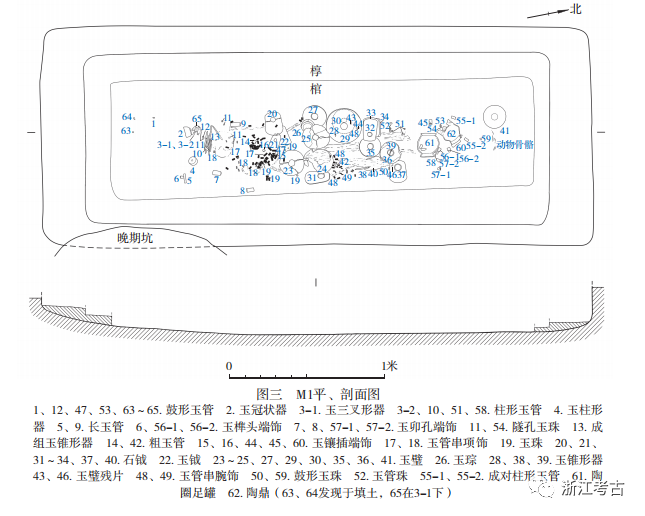 姜家山西坡在南宋时期破坏严重,表土以下多有厚薄不均的灰褐色宋元时期地层(第2层)以及瓦砾坑,广泛分布于整个发掘区。在2018年西扩探方(T2134)内,第2层下还分布有第3层,较薄,红褐色土,夹杂较多红烧土颗粒,出土少量良渚文化晚期后段陶片及宋元时期瓷片,也属宋元时期。大部分发掘区第2层及第3层下即为红色原生山体土。仅在墓地东南部T2036探方中东部第2层下、山体土上残留少量良渚文化堆筑土(第4层),为黄褐色土,土质纯净,M7即叠压于第2层下并打破第4层,其余墓葬均叠压于第2层下并打破红色山体土。可见,这批墓葬的原始开口层位早已被宋代等晚期堆积破坏,墓葬埋设之前堆筑土几乎不存。姜家山墓地共清理墓葬17座,已进行基本全面的揭露,不过所有墓坑现存深度均较浅,故不能排除有少量墓葬被完全扰乱破坏的可能。墓坑均为长方形竖穴土坑墓,仅部分墓葬残存少量人骨渣,保存极差。墓坑略呈东北-西南向或南北向,根据以往瑶山等墓地发掘的情况,可知石钺、三叉形器、成组锥形器基本出自男性墓,而玉璜、纺轮、甑、过滤器则基本出自女性墓,由此可通过遗物大致推断墓主的性别。据此判断姜家山墓地中男女头向存在明显的差异,除出土玉璜的女性墓M7头朝南外,所有女性墓均头朝北或北略偏东,而男性墓均头朝南或南略偏西。部分墓葬可见棺椁痕迹,部分墓葬仅见棺痕,少量小墓不见棺椁痕迹。随葬品以玉器为主,种类有琮、璧、冠状器、三叉形器、璜、锥形器、柱形器、镯、端饰、管、珠等;陶器、石器次之,陶器有鼎、豆、圈足罐、盆、过滤器、甑等,石器仅钺一种,另出少量鲨鱼牙(附表)。现以M1、M8、M11和M14四座墓葬为例加以介绍。位于T2035东北部、T2135东南部,极小部分伸入T2036和T2136,处于墓地南排偏东,西部紧靠M2,东邻M7。叠压于第2层下,打破生土,为长方形竖穴土坑墓。东南一小部分被一处晚期坑破坏。发掘时首先刮面划出了墓坑边线及椁边线,墓坑内填土为红褐色土,夹少量灰白色土及灰色土块,土质较硬,墓坑长3.62、宽1.35、深0.24米;椁内填土为红色灰斑土,夹较多红色土块、灰白色土块,土质较疏松,发掘中未见明显的椁板及椁盖朽痕,椁长3.05、宽1.05米,椁板厚度不详。墓坑内水平向下发掘5厘米后刮面,可见清晰的棺范围,长2.78、宽0.7米,棺内填土为浅灰色土,夹杂大量灰白色土,土质疏松而细腻,平面上无法划出棺侧板朽痕,但从预留的小隔梁可观察明显的棺底板及棺侧板痕迹,为细腻的灰白色土,厚约4厘米,棺底为凹弧状,由此可推测葬具为独木舟式的凹弧底木棺。人骨保存情况较差,仅能分辨出头骨、部分肋骨、两侧桡尺骨、两侧股骨、两侧胫腓骨的残迹,头向朝南,面向、年龄皆不详。墓主头朝南略偏西,头向190度。根据成组锥形器、三叉形器、钺等性别指示特征明显的玉器推测墓主为男性。随葬器物均位于棺内,除63、64号玉珠出土于棺内填土靠上部外,其余器物均出土于靠近棺底的位置。编号65件组,以单件计175件,其中玉石器55件组,以单件计165件,包括玉琮1件、玉璧9件、玉钺1件、石钺8件、成组玉锥形器1组7件、玉冠状器1件、玉三叉形器1组2件以及玉柱形器1件、玉端饰10组12件以及大量玉管、珠等,是姜家山墓地内随葬品最丰富的男性墓葬,属良渚文化贵族大墓。随葬品集中分布于墓坑东部人骨残迹周围(图三)。