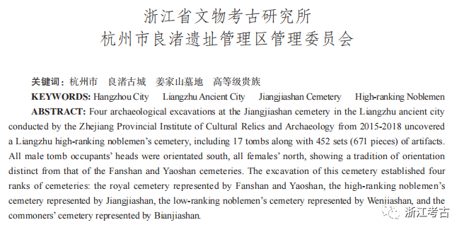 从层位上看,姜家山墓地的这批墓葬开口均遭到严重破坏,叠压于宋代层下,打破生土或良渚文化堆筑土,墓坑保存较浅。M1、M8出土的陶鼎、过滤器、圈足罐和玉冠状器的形态和风格与反山M20、M22和M23出土器物接近,属良渚文化早期偏晚。也有部分墓葬如M11、M14等出土有陶锥足鼎、细柄豆,年代应属良渚文化晚期早段。因此,姜家山墓地的总体年代属良渚文化早期晚段至良渚文化晚期早段。姜家山最高等级的男性墓M1,规格介于反山M17和M15之间,仅高于反山M18,大致相当于反山墓地的第三等级[1]。此外,墓地中既有贵族墓葬,如M1、M2、M3、M6、M13等男性墓和M4、M7、M8等女性墓;也有随葬品在10件以内等级较低的墓葬,如M5、M9、M10、M11、M12、M14、M17。M15出土随葬品18件,属较富裕的平民墓,M16则是一座空墓。从墓地中墓葬数量来看,应是一处家族墓地。姜家山墓地位于姜家山台地的西坡,台地顶部和东部为居住区,显示出居葬合一的特征。姜家山墓地是良渚遗址群范围内发掘的一处良渚文化时期包含高等级贵族墓葬的墓地,其墓葬等级低于属王族墓地的瑶山[2]、反山墓地,高于属低等级贵族墓地的文家山墓地[3]和属平民墓地的卞家山墓地[4],丰富了良渚遗址群内不同等级墓地的相关资料,为我们探讨良渚文化时期墓地和墓葬的分化提供了重要参考。男性墓与女性墓除了随葬品外,主要以头向来区分,男性墓均头朝南,女性墓除M7外均头朝北,与文家山、卞家山墓地一致。而瑶山、反山、庙前墓地无论男性还是女性头向均朝南。两类墓地的随葬品组合、风格一致,但男女性头向方面却存在很大差异,可能分属不同的人群。我们曾推测男女异向的人群可能是本地人群,而男女同向的人群可能是外地人群,良渚王国的诞生是两种人群整合的结果[5],如此,则说明了地缘组织存在的可能性。附记:本次考古发掘领队为浙江省文物考古研究所的刘斌,先后参与发掘的人员有浙江省文物考古研究所王宁远、陈明辉、朱叶菲、宋姝、姬翔、汪飞英、范畴、陈全合、芦西燕、孟小玲、史全兴、刘晓伟、王晗、侯蓓蓓、文倩倩等。本文遗迹和遗物线图由朱叶菲、宋姝、刘晓伟、张念哲、陈珊珊、周佳辉绘制,现场和器物照片由陈明辉、李永嘉拍摄,朱叶菲、宋姝参与了资料整理。[ 1 ] 浙江省文物考古研究所:《反山》,文物出版社,2005年。[ 2 ] 浙江省文物考古研究所:《瑶山》,文物出版社,2003年。[ 3 ] 浙江省文物考古研究所:《文家山》,文物出版社,2011年。[ 4 ] 浙江省文物考古研究所:《卞家山》,文物出版社,2014年。[ 5 ] 陈明辉:《环太湖地区史前时期头向传统的区域差异及演变—兼谈良渚古城崛起的背景》,《博物院》2019年第2期。