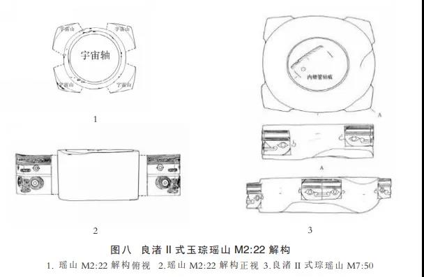 值得说明的是,良渚城址的城墙虽建于良渚晚期,主要流行III式琮,但是堆筑城墙的建造过程中,不可能把四隅的宇宙山都削成90°直角,大致象形II式琮即可。楚帛书创世章里,讲述伏羲-女娲的四子定立天地,其实就是用东、西、南、北、中五根天柱撑开天地,后来尽管夏禹和商契划定了九州,但是九州不平,大地和山陵向一侧倾斜,四子又来到天盖上,重新维护支撑天盖的五根天柱,推动天盖围绕北极转动。我们可以将这段神话理解为良渚文化III式玉琮四隅变为直角的“宇宙支柱”,上面刻画着或繁或简的“四子”戴介字形冠神人符号,玉琮的圆筒体则作为中天柱,整个天盖以射孔宇宙轴围绕天极转动(图一四:1、2),瑶山M2:2和3带盖柱形器,可以表明良渚文化存在天盖的观念(图一四:3)。上述关于良渚玉琮形制变化分析,主要涉及良渚文化宇宙观模型和创世神话回溯性分析,大致可以知道良渚文化玉琮所表现的宇宙模型,不变是上、中、下三界观念,变化的是后来加入宇宙山和宇宙支柱的观念。良渚玉琮所蕴含的创世神话,在楚帛书创世章里,找到一些蛛丝马迹,大致可知为“伏羲-女娲及其四子”独特的创世神话体系。只不过,伏羲-女娲是后世文献的命名,我们不知道良渚文化的人是如何称他们的天父和地母的,但是神话中的神格和性质,应当与楚帛书创世章“伏羲-女娲及其四子”创世神话体系基本一致。特别值得关注的是,楚帛书创世章说伏羲是有能氏,冯时先生解释“能”即“龙”,那么良渚文化龙首纹玉器,可以为良渚文化创世神话与楚帛书创世章神话体系的关系,再加一环证据链。良渚文化国家统治者,以玉为材质,以宇宙模型为形态,以创世神话为国家文脉的记忆进行装饰艺术化,创制了良渚玉琮象征图形符号系统,在良渚文化区内推行。玉琮的上、中、下三界以及宇宙山,是有一定具象的宇宙模型,同装饰艺术化的神徽图像,构成了象征图形符号的规范的、正式的表达内质与形式。良渚文化国家的统治者,教育“国民们”都是创世英雄“伏羲-女娲及其四子”的后人,从而引导他们情感认同上的“共情”,这是象征图形符号的内容的内质。而玉琮神徽图像与宇宙观模型高度聚合,具有一种既可感知又必须诉诸想象的神妙莫测的效果,这便是象征图形符号的内容的形式。凡是按照良渚玉琮使用规制随葬的人,都自我认同或被他人认同为“良渚国民”,所以良渚玉琮不仅是良渚文化的宗教法器,更是良渚国家政体推行的“国家认同”的象征图形符号。诚然,国家社会象征图形符号系统的衍生功能,便是强化社会秩序稳定的功能,表现在良渚文化的玉琮上,便是玉琮随葬的等级制度。虽然良渚玉琮集中随葬在权贵墓葬中,但是追随权贵的其他良渚文化墓葬的墓主人,在理论上也认同玉琮象征图形符号,因此也认同“良渚国家”。而山东五莲丹土遗址出土玉琮与华西系玉琮,显然都是对良渚文化玉琮的“篡改”,与良渚国家认同没有任何关系,完全丧失了良渚玉琮原本作为国家社会象征图形符号系统的功能。