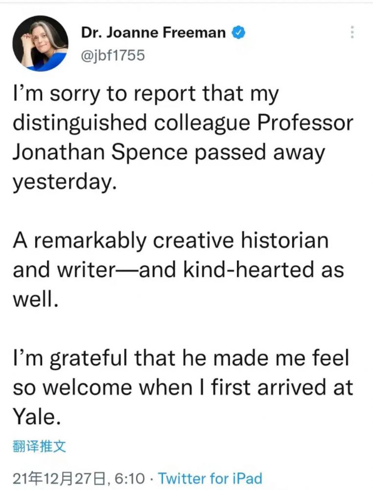 史景迁(Jonathan D. Spence)(1936年8月11日-2021年12月26日) 据学人君多次确认,著名历史学家、耶鲁大学荣誉教授史景迁于当地时间2021年12月26日辞世,享年85岁。