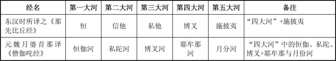 姚秦时佛陀耶舍共竺佛念等所译之《四分律》第三十六记五大河:“五大河:恒河、阎摩那、萨罗、阿夷罗婆提、摩河,皆投于海而失本名。”而后秦时鸠摩罗什译《海八德经》第一则记: "普天之下有五大河,流行注海。西流者名恒;南流者名邪云;东流者两河,一名沙陆,一名阿夷越;北流名墨。五河流(迈)[?]俱入于海。" 刘宋时求那跋陀罗所译《杂阿含经》第三十六记五大河: "譬如五大河合为一流,所谓恒河、耶蒲那、萨罗由、伊罗跋提、摩酰。如是,五河合为一流,无有人能量其河水百千万亿斗斛之数。" 为方便论述起见,我们将上述佛典中有关“五大河”排序及名称纳入以下列表中,以资对比。