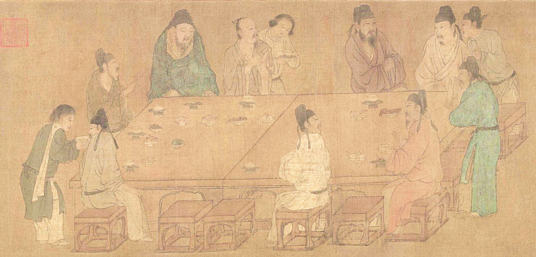 ↑宋徽宗 赵佶 《文会图》(局部) 台北故宫博物院藏 “消夜果”一词,最早见于南宋时期,并多次出现于南宋词人的作品中。如薛泳的《青玉案·守岁》词云:
